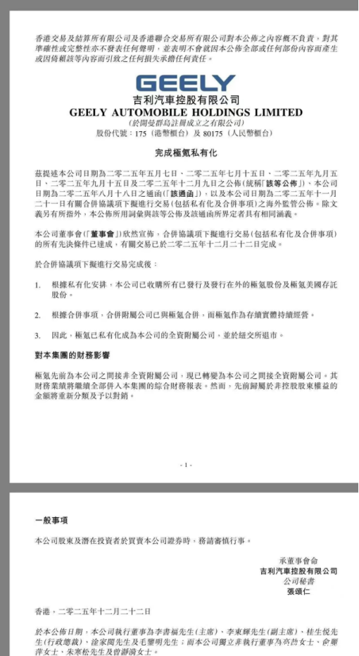 12月22日,祯祥汽车控股有限公司(0175.HK)(简称“祯祥汽车”)发布公告,文告已认真完成极氪智能科技控股有限公司(简称“极氪”)独到化及清除事项的走动,极氪已成为祯祥汽车的全资附庸公司,并于纽交所退市。